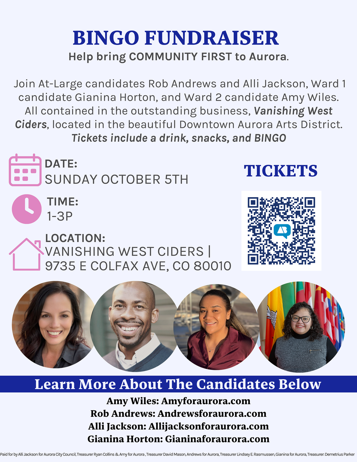 I am thrilled to partner with Aurora At-Large Candidate Alli Jackson, local business Vanishing West Ciders and Aurora artist and TikTok Star Buddy Rich C for a night of live music and conversation. Please join us!